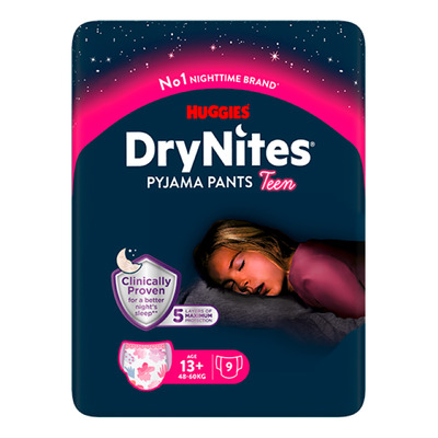 Huggies DryNites Girls 13+ år är absorberande natt-trosor för barn som ger komfort och effektiv absorptionsförmåga