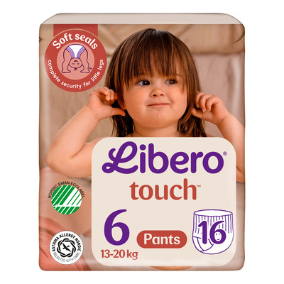 Libero Touch 6 är avsedda för äldre barn med en kroppsvikt på 13-20 kg. Blöjorna är flexibla och har en bekväm passform som följer barnets rörelser. Den mjuka, textilliknande ytan känns skonsam mot huden och ger komfort hela dagen. Blöjorna är dermatologiskt testade och Svanenmärkta. Blöjorna har en effektiv uppsugningsförmåga som håller huden torr längre, även vid större mängder vätska.