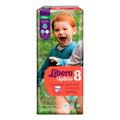 Libero Up&Go 8 Byxblöja har en superabsorberande kärna kombinerad med dubbla läckagebarriärer för ett effektivt läckageskydd dygnet runt. Blöjorna är utan lotion, dermatologiskt testade, Svanenmärkta och rekommenderas av Asthma Allergy Nordic. De är också certifierade av FSC.