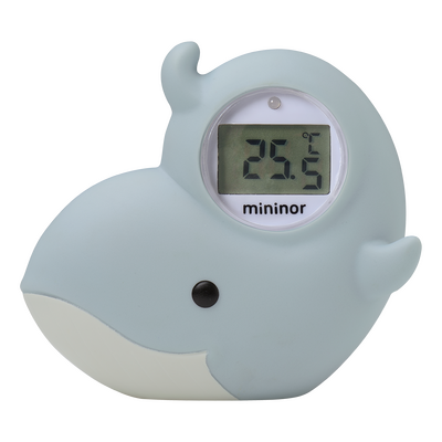 Mininor Badtermometer Val är en digital badtermometer formad som en söt val som kan användas både som badleksak och för att mäta vatten- och rumstemperatur. Termometern tänds automatiskt vid kontakt med vatten och den stora displayen gör den lätt att läsa av. Om badvattentemperaturen överstiger 39°C blinkar en röd lampa som varning och en blå lampa blinkar om vattnet är för kallt.