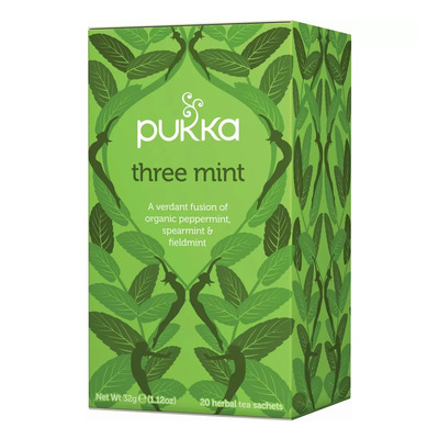 Three Mint från Pukka är ett fantastiskt örtte framställt av tre olika sorters ekologisk mynta - pepparmynta, krusmynta och åkermynta - som tillsammans ger en intensiv smakupplevelse. Det är både sött, aromatiskt och underbart friskt. Teet består av 100% ekologiskt odlade ingredienser och är naturligt koffeinfritt.