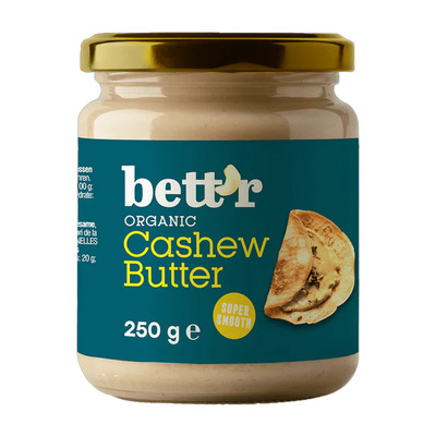Bettr Cashew Butter är ett krämigt och utsökt ekologiskt cashewsmör gjort på 100% rostade cashewnötter. Med sin silkeslena konsistens är detta cashewsmör perfekt som pålägg, i smoothies eller som ingrediens i bakning.