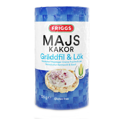 Friggs Majskakor Gräddfil & Lök är krispiga majskakor med smak av gräddfil och lök. De är gjorda av puffade majskärnor. Produkten är glutenfri och passar som ett lätt mellanmål eller som ett alternativ till chips. Smaken är mild och avrundad med inslag av lök och gräddfil för en balanserad mellanmålsupplevelse.