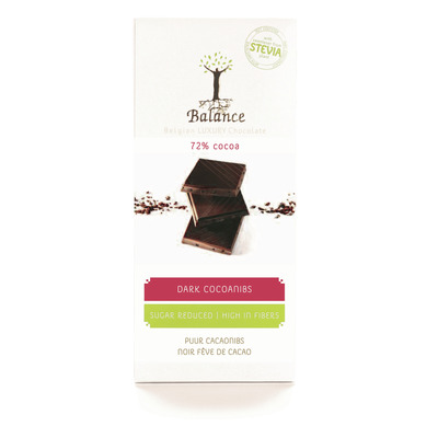 Mörk lyxchoklad från Balance Stevia med läckra, bittra kakaonibs