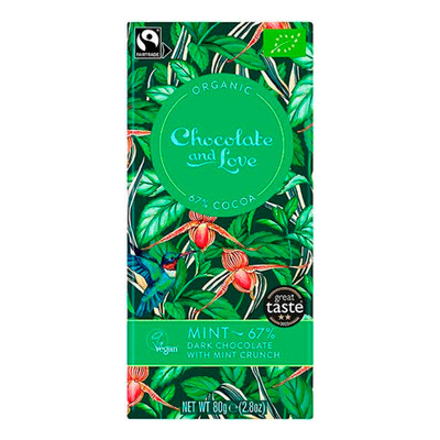 Chocolate and Love Chocolate Mint 67% är en ekologisk mörk choklad med 10% pepparmyntscrunch som består av rörsocker och naturlig pepparmyntsolja. Kakaon kommer från Fairtrade-certifierade kooperativ i Peru och Dominikanska republiken och 99% av råvarorna är Fairtrade. Chokladen tillverkas i Schweiz och har vunnit 1 Gold Star vid Great Taste Awards 2021.
