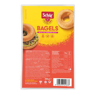 Schär Bagels är läckra glutenfria bagels som passar perfekt till både söta och salta pålägg. De har en mjuk, saftig konsistens och en mild, neutral smak som gör dem mångsidiga till alla måltider. Bagels är skurna i halvor och redo att rostas, värmas eller ätas som de är. De är vete-, gluten- och laktosfria.