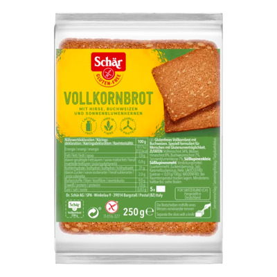 Schär Fullkornsbröd är ett glutenfritt formbröd med en klassisk, kompakt konsistens. Brödet är bakat med hirs, bovete och solrosfrön för en rik smak och bra struktur. Brödet har en mörk färg och ett tät textur som gör att det passar till både söta och salta pålägg.