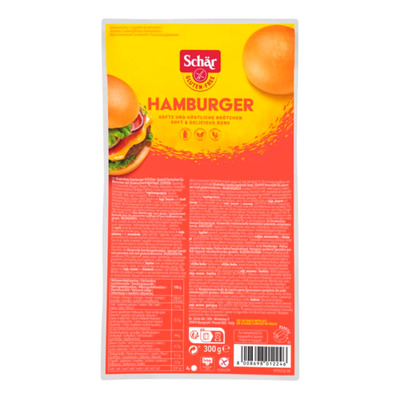 Schär Hamburgerbröd är glutenfria hamburgerbröd i en förpackning om 2 st. Bröden har en mjuk och enhetlig konsistens med en mild och neutral smak.