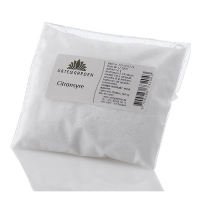 Urtegaarden Citronsyra är kemiskt ren citronsyra (C6H8O7) i pulverform. Citronsyran är tillverkad naturidentisk vid jäsning (fermentering) av sockerrika råvaror som t.ex melass eller stärkelse.