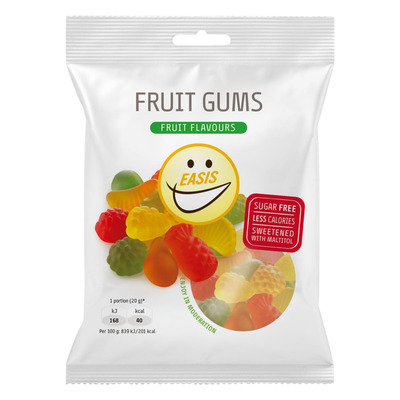 Easis Fruit Gums är sockerfria, fruktsmakande vingummibitar med högt fiberinnehåll. De är sötade med maltitol och innehåller naturliga smak- och färgämnen. Produkten har 40% färre kalorier än liknande vingummi med socker och innehåller endast 136 kcal per 100 g.