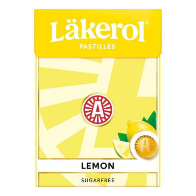 Läkerol Lemon är en stor förpackning sockerfria sugtabletter med en sötsyrlig citronsmak