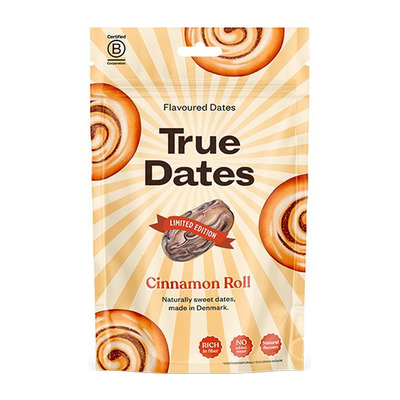 True Dates Cookie Dough kombinerar sötman från dadlar med smaken av en söt kanelbulle. Dadlarna är ett utsökt alternativ till traditionella sötsaker. True Dates Cinnamon Roll är rik på fibrer, har inget tillsatt socker och innehåller endast naturliga smaker. Varje tugga erbjuder en harmonisk balans av smaker för att tillfredsställa dina smaklökar. True Dates är perfekta för dig som vill ha något sött. Observera att dadlarna kan innehålla kärnor eller fragment av kärnor.
