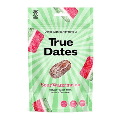True Dates Sour Watermelon kombinerar sötman från dadlar med smaken av söt/syrlig vattenmelon Dadlarna är ett utsökt alternativ till traditionella sötsaker. True Dates Sour Watermelon är rika på fibrer, har inget tillsatt socker och innehåller bara naturlig smak. Varje tugga bjuder på en harmonisk smakbalans som tillfredsställer dina smaklökar. True Dates är perfekta för dig som vill ha en söt godbit. Observera att dadlarna kan innehålla kärnor eller fragment av kärnor.