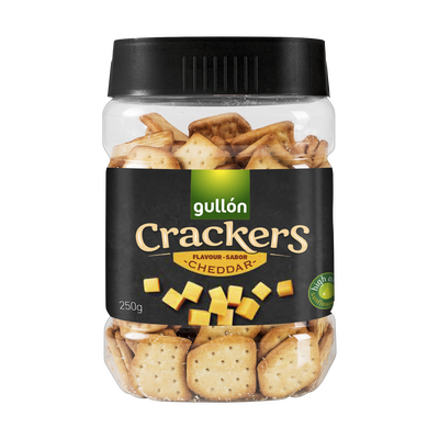 De spröda kexen från Gullón är perfekta att dela med familjen, vänner eller på jobbet! Gullón Crackers Cheddar är små läckra kex som kan passa bra i matlådan eller bara njutas direkt från burken. Kexen har en underbar cheddarsmak som passar de flesta. Dessutom saltas kexen, vilket ger en särskilt smakrik twist.