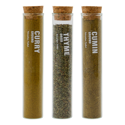 Nicolas Vahé Spices Curry, Thyme, Cumin passar till allt från simmande och grönsaksrätter till kött, marinader och globalt inspirerade rätter. De tre kryddorna levereras i eleganta glasrör med korkpropp, vilket gör dem både dekorativa och enkla att använda i matlagningen.
