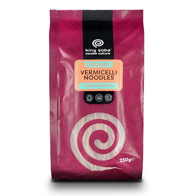 King Soba Vermicelli nudlar produceras av certifierat Fairtrade ekologiskt råris och har en läcker nötaktig smak och en lätt och elastisk konsistens. De är vete- och glutenfria.