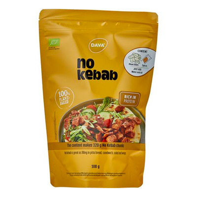 Dava No Kebab är ett ekologiskt växtbaserat köttsubstitut tillverkat av extruderat ärtprotein. Produkten har ett högt innehåll av protein och kostfiber, vilket gör den till ett hälsosamt och mättande alternativ till kött. No Kebab är lätt att tillaga och påsen innehåller 350 g färdig kebab. Den kryddiga smaken gör den till en mångsidig ingrediens i många rätter och garanterar en fantastisk smakupplevelse.