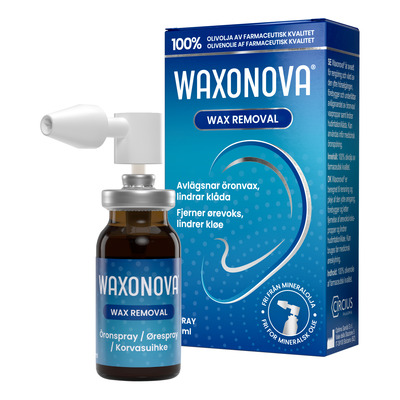 Waxonova är en spray för rengöring och vård av den yttre hörselgången. Waxonova återfuktar och smörjer huden i hörselgången. Waxonova spray bildar en skyddande film i den yttre hörselgången och underlättar avlägsnandet av öronvax och vaxproppar. Produkten kan användas av alla vuxna och barn.