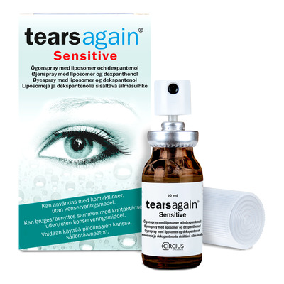 Tearsagain Sensitive är en liposom ögonspray med dexpantenol, speciellt utvecklad för att lindra symtom på torra, brännande, kliande, trötta, rinnande eller irriterade ögon och känslan av främmande föremål i ögat. Den stabiliserar och skyddar tårfilmen och återfuktar både ögats yta och ögonlocken, vilket gör kontaktlinsbärande mer bekvämt.