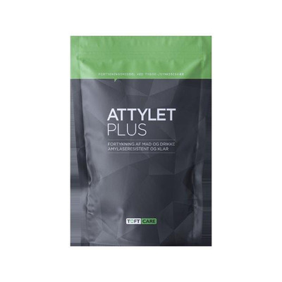 Toft Care Attylet Plus är ett förtjockningsmedel utvecklat med amylasresistenta egenskaper. Det innebär att konsistensen på den förtjockade vätskan behålls i munnen eftersom den inte bryts ned av saliven. Produkten är lämplig för förtjockning av både kalla och varma vätskor och används direkt från förpackningen. Den har en slät konsistens och ett klart utseende och levereras med en praktisk måttsked.