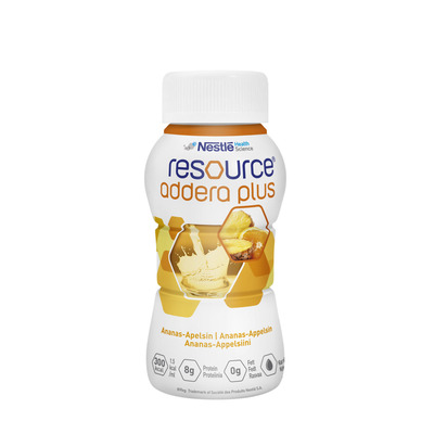 Resource Addera Plus har fräsch och naturlig smak eftersom den innehåller naturlig fruktjuice. Den har en hög halt av protein, som bidrar till återuppbyggnaden av kroppen. Proteinet består av 100% vassleprotein, vilket är bra för matsmältningen och underlättar tarmfunktionen. Drycken används som ett komplement till kosten och inte som enda näring.