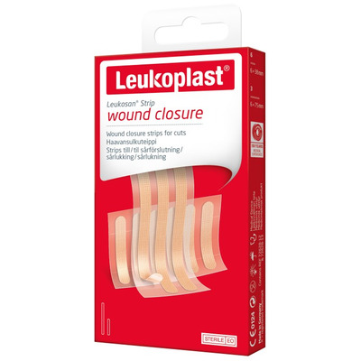 Leukoplast Leukosan Strip innehåller 9 st smala plåster designade specifikt för t.ex. små skärsår inom de första 6 timmarna. Plåstren är sterila och utrustade med ett hudvänligt akryllim som hjälper till att stänga små sår och revor säkert och smärtfritt. Plåstren är lätta att ta bort igen efter användning.