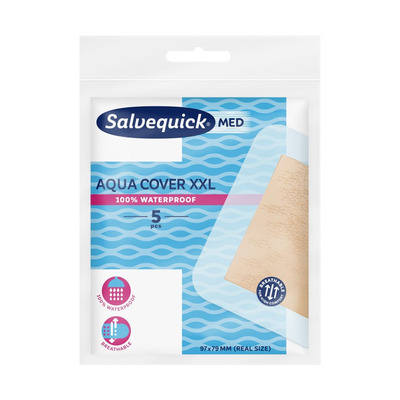 Salvequick MED Aqua Cover XXL är ett extra stort och vattenresistent plåster som skyddar såret från smuts samtidigt som huden kan andas för snabbare läkning. Plåstret är tillverkat av självhäftande film och ett extra elastiskt material. Plåstren är särskilt lämpliga för stora sår som vanliga plåster inte kan täcka.