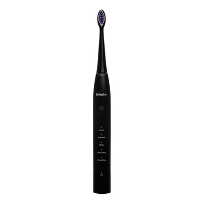 B.Well PRO-850 Elektrisk Sonic Tandborste i färgen svart levererar avancerad och skonsam rengöring av tänder och tandmellanrum och erbjuder tandköttsmassage tack vare sin soniska oscillerande rörelseteknik. Denna teknik säkerställer djuprengöring av även de mest svåråtkomliga områdena och är effektiv för att ta bort upp till 100% av plack. Tandborsten är utrustad med fem driftlägen som gör att den kan anpassas till olika tandvårdsbehov, från daglig rengöring till djup blekning och skonsam vård för känsliga tänder. Tandborsten har en smart timer som ser till att du borstar i de rekommenderade två minuterna, med en 30-sekunders påminnelse om att byta borstområde.