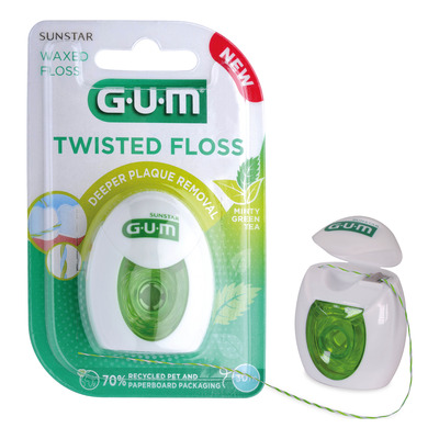 Använd Gum Twisted Floss dagligen för att avlägsna plack och matrester mellan tänderna och längs tandköttskanten.