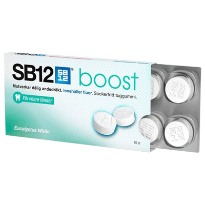 SB12 Boost tuggummi (eukalyptus) med utsökt eukalyptussmak motverkar dålig andedräkt och ger dig ett vitare leende