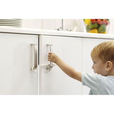 Med ett dubbelt skåplås kan du se till att ditt barn inte kan öppna lådor och skåp, som kan innehålla farliga saker för ditt barn. Låset är lätt att fästa på 2 dörrar med handtag placerade sida vid sida.