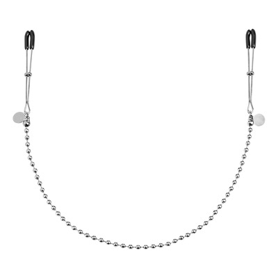 Obaie Adjustable Chained Chest Clamps med kedja är tillverkade av nickelfritt järn och har ett vackert gunmetal-utseende. Gummibeläggningen på klämmorna säkerställer komfort under användning, samtidigt som trycket fortfarande känns tydligt. De är perfekta för både solospel och frestande dominansspel med en partner.
