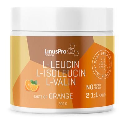 LinusPro aminosyror är ett välsmakande pulver som lätt löser sig i vätska. BCAA eller "förgrenade aminosyror" består av de 3 essentiella aminosyrorna leucin, isoleucin och valin. Dessa tre aminosyror ingår i de 9 essentiella aminosyrorna, som kroppen inte själv kan tillverka och därför måste fås via kosten.