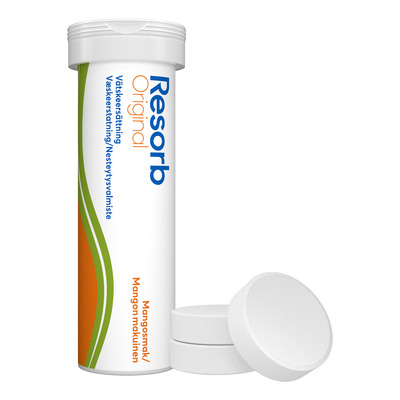 Resorb Original Mango är en kolhydrat-elektrolytlösning i brustablettform som hjälper till att återställa vätske- och saltbalansen. Detta är ett kosttillskott som är utformat för att användas under eller efter fysisk aktivitet när kroppens vätskeintag är i obalans. Kombinationen av elektrolyter och kolhydrater stödjer kroppens naturliga förmåga att absorbera vätska mer effektivt.