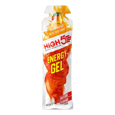 High5 Energy Gel Mango är en energigel för användning före och under träning. Varje 40 g-påse innehåller 23 g kolhydrater och är gjord med äkta mangojuice för en lätt och fräsch konsistens. Gelen är fri från artificiella sötningsmedel, färgämnen och koffein.