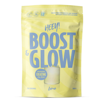 Heey! Boost & Glow Creatine + Coll-egan® Lemon är ett kreatintillskott med växtbaserade ingredienser för huden
