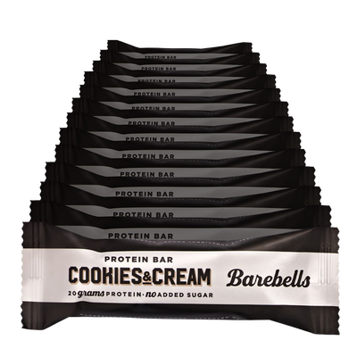 Barebells Cookies & Cream är en krämig och mättande proteinbar med 20 g protein, inspirerad av den klassiska dessertkombinationen av kakaokex och grädde. Baren har en mjuk konsistens med krispiga kakaonibs och är överdragen med mjölkchoklad - utan tillsatt socker.