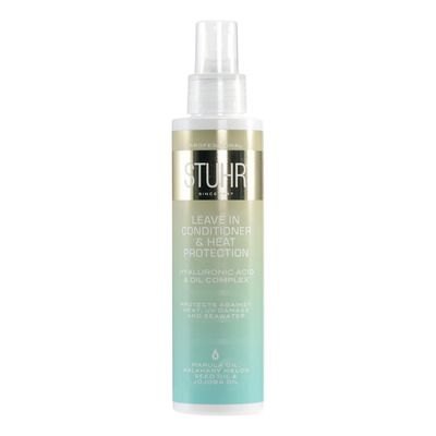 STUHR Styling Hyaluronic Acid Leave-in Conditioner & Heat Protection är en multifunktionell värmeskyddande leave-in spray som skyddar mot värme från stylingelektronik, UV-strålar och havsvatten. Den förbättrar omedelbart hårets kvalitet, hanterbarhet och glans och minskar frissighet. Håret blir återfuktat, mjukare och lättkammat. Oljorna i formulan tillför näringsämnen, antioxidanter, vitaminer och fettsyror till hår och hårbotten.